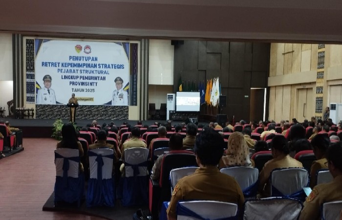 Kupang, VoxNTT.com – Gubernur Nusa Tenggara Timur (NTT), Melki Laka Lena, secara resmi menutup rangkaian kegiatan Retret Aparatur Sipil Negara (ASN) lingkup Pemerintah Provinsi NTT yang dilaksanakan di Universitas Pertahanan (Unhan) Belu. Penutupan kegiatan tersebut berlangsung di Aula El Tari, Kantor Gubernur NTT, pada Senin, 13 Oktober 2025 siang.