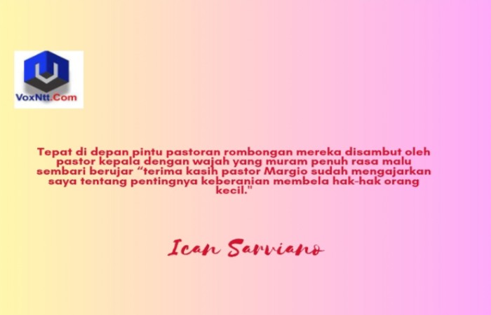Tepat di depan pintu pastoran rombongan mereka disambut oleh pastor kepala dengan wajah yang muram penuh rasa malu sembari berujar “terima kasih pastor Margio sudah mengajarkan saya tentang pentingnya keberanian membela hak-hak orang kecil.”