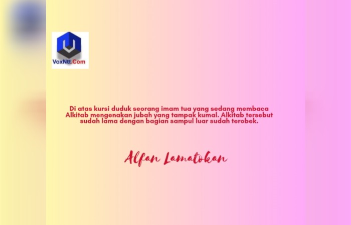 Di atas kursi duduk seorang imam tua yang sedang membaca Alkitab mengenakan jubah yang tampak kumal. Alkitab tersebut sudah lama dengan bagian sampul luar sudah terobek.
