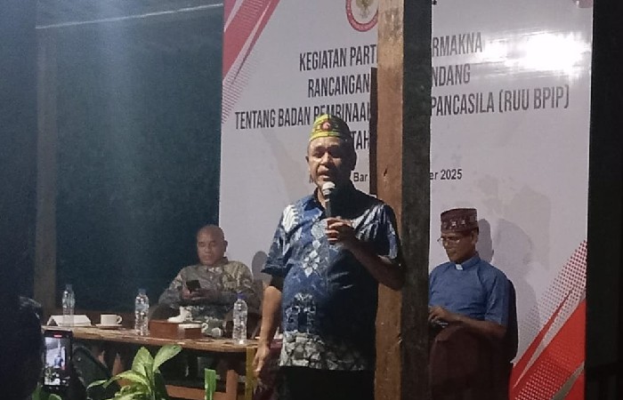 Anggota DPR RI Fraksi Partai Demokrat Benny Kabur Harman saat menjadi narasumber dalam kegiatan Partisipasi Bermakna Rancangan Undang-undang Tentang BPIP di Say Se'i Labuan Bajo, Minggu, 2 November 2025 (Foto: Sello Jome/Vox NTT)