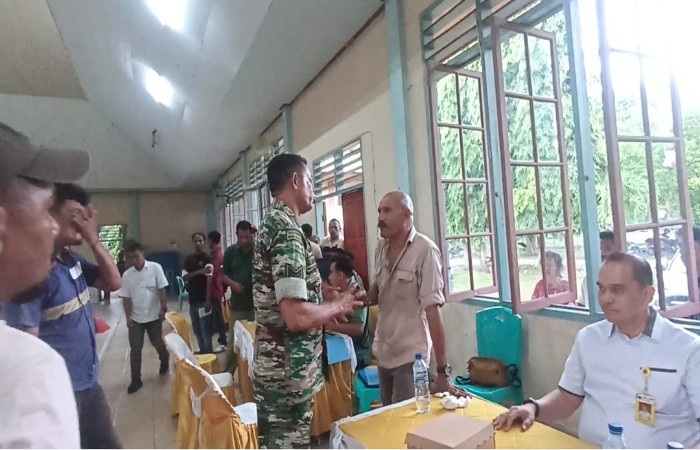 Anggota TNI, Albert dan Rudi, segera membatasi gerak Wunibaldus yang berupaya mendekati Kepala BPN yang sedang duduk di meja sisi selatan aula bersama sejumlah pegawai lainnya.