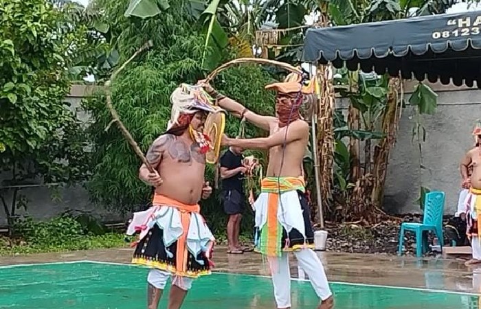 Setelah itu, sekitar 20 laki-laki tampil sebagai tangkas dalam tradisi Caci. Mereka mengenakan busana adat lengkap sebagaimana pemain Caci Manggarai.