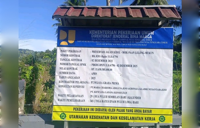 Proyek yang menggunakan dana Inpres tersebut tercatat dengan nama Preservasi Jalan Kisol–Mok–Paan Leleng–Mukun, nomor kontrak HK.0201-bpjn 11.8.4/794, dengan nilai Rp 15,6 miliar.