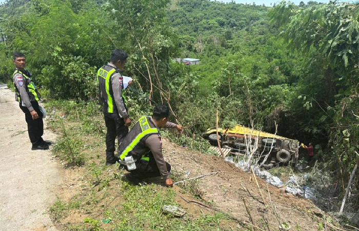 Labuan Bajo, VoxNTT.com – Kecelakaan lalu lintas tunggal terjadi di Labuan Bajo, Kabupaten Manggarai Barat, Nusa Tenggara Timur (NTT). Sebuah dump truk terjun ke jurang sedalam 15 meter di kawasan penurunan Binongko. Insiden ini menyebabkan satu orang meninggal dunia dan tiga lainnya luka-luka.