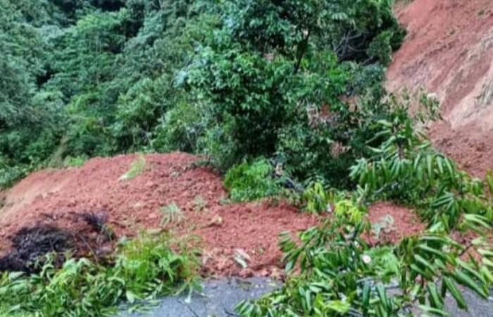 Kendaraan roda dua dan roda empat belum dapat melintas karena seluruh badan jalan tertimbun material longsor.