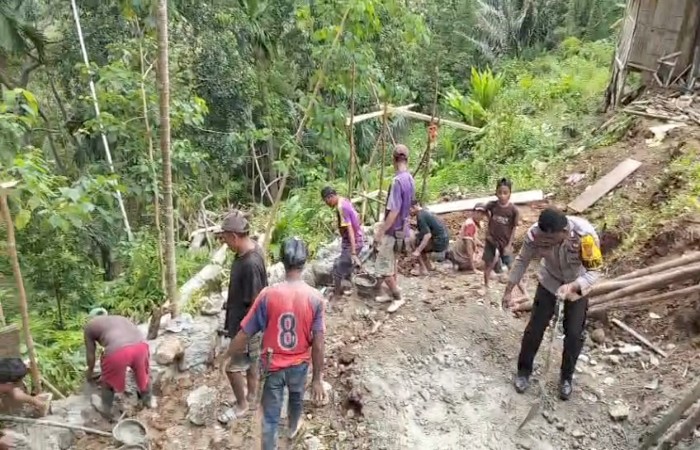 Dalam kegiatan tersebut, Bhabinkamtibmas Kecamatan Cibal Barat, Bripka Agustinus Yatarten, turut hadir dan terlibat langsung dalam proses pembangunan.