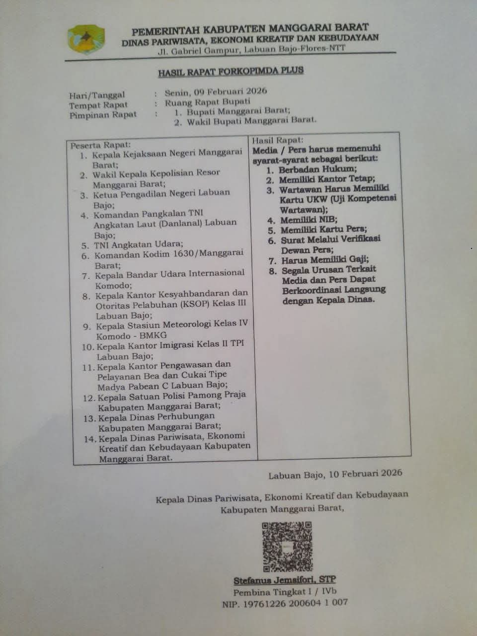 Surat hasil Rapat Forkopimda Plus Pemerintah Kabupaten Manggarai Barat